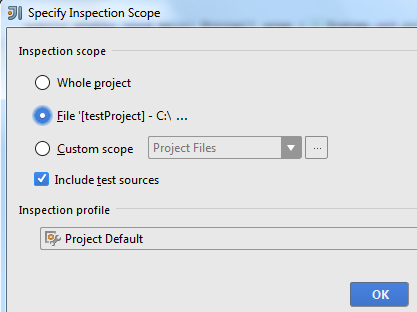 After you are done with the scope editing, just click it to finish selecting it. Then, in the initial Inspect Code popup, you must choose the profile for running the inspections. A default profile is selected at this time, which is a very comprehensive one.