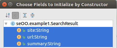 For the expected content there is an easy way to create the constructor. For the expected, you know exactly what the values of those three properties are, therefore you will construct a new object based on those three values by using the constructor that takes as parameters three Strings, one for each of the properties. This constructor is easy to build, since in IntelliJ there is a shortcut for constructors taking one parameter for each property: within the SearchResult class, hit Alt + Ins on your keyboard.