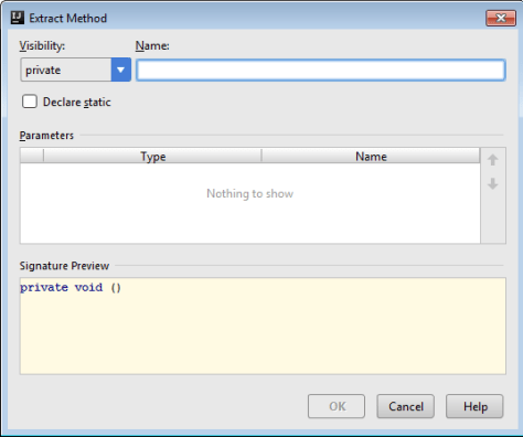 The first thing to consider is where you will store this new method and what kind of visibility modifier you want to add to it. If you store it in the same class in which you are currently working, make it private. If you would like to move the repeating code into a class that you will extend, you should make it protected. Public is not usually recommended, but if you want to choose it, go ahead. The visibility modifier is set from the drop down from the top left side of the window.