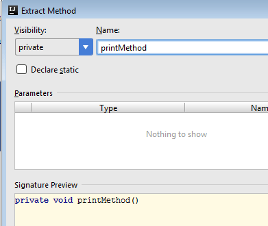When you are trying to extract methods from duplicate code you could either manually create the method, move the code inside it and replace the initial code with a call to the new method. Or, if you are using IntelliJ, you can do this automatically. Below you can see how.