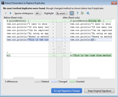 I will accept the suggestion, and so i will get yet a new screen asking me for the first encounter of the duplicate code – if i want to change it to the new method call.