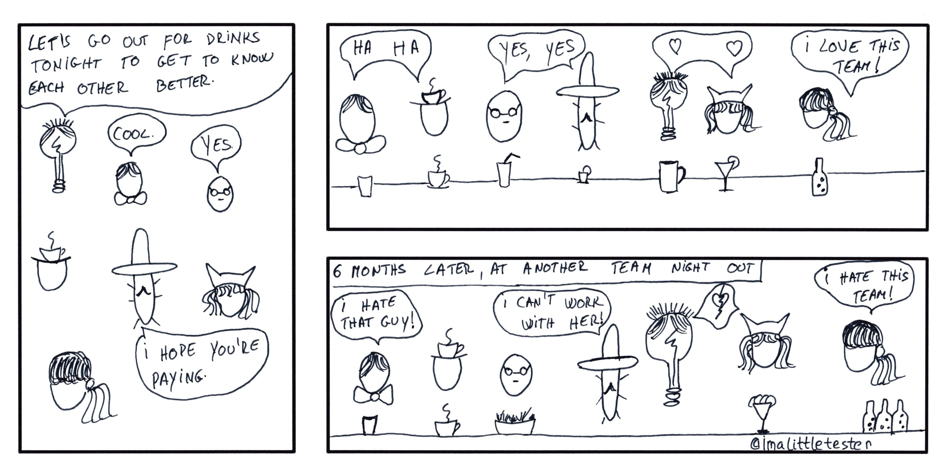 These are the made up stories of a team working in an Agile environment. Their daily struggles and successes are presented in a comic/parody/satirical way. Click on the image to see it in full size.