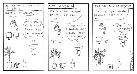 These are the made up stories of a team working in an Agile environment. Their daily struggles and successes are presented in a comic/parody/satirical way. Click on the image to see it in full size.