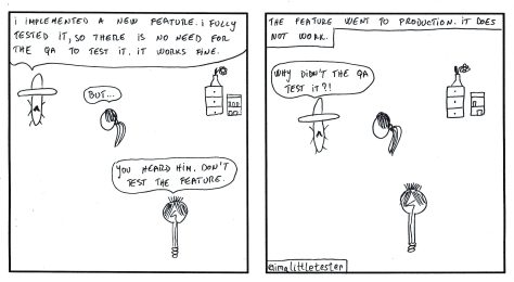 These are the made up stories of a team working in an Agile environment. Their daily struggles and successes are presented in a comic/parody/satirical way. Click on the image to see it in full size.