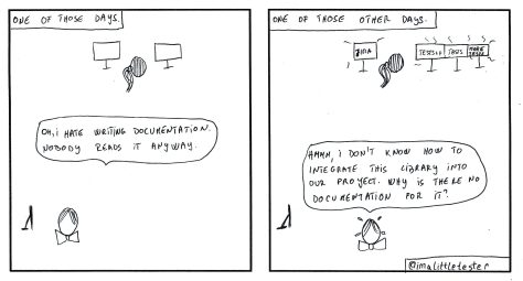 These are the made up stories of a team working in an Agile environment. Their daily struggles and successes are presented in a comic/parody/satirical way. Click on the image to see it in full size.