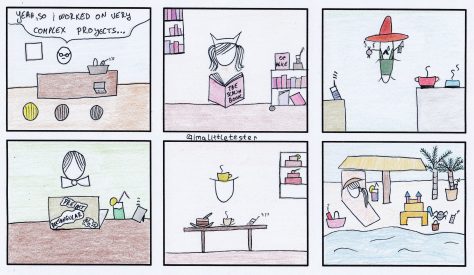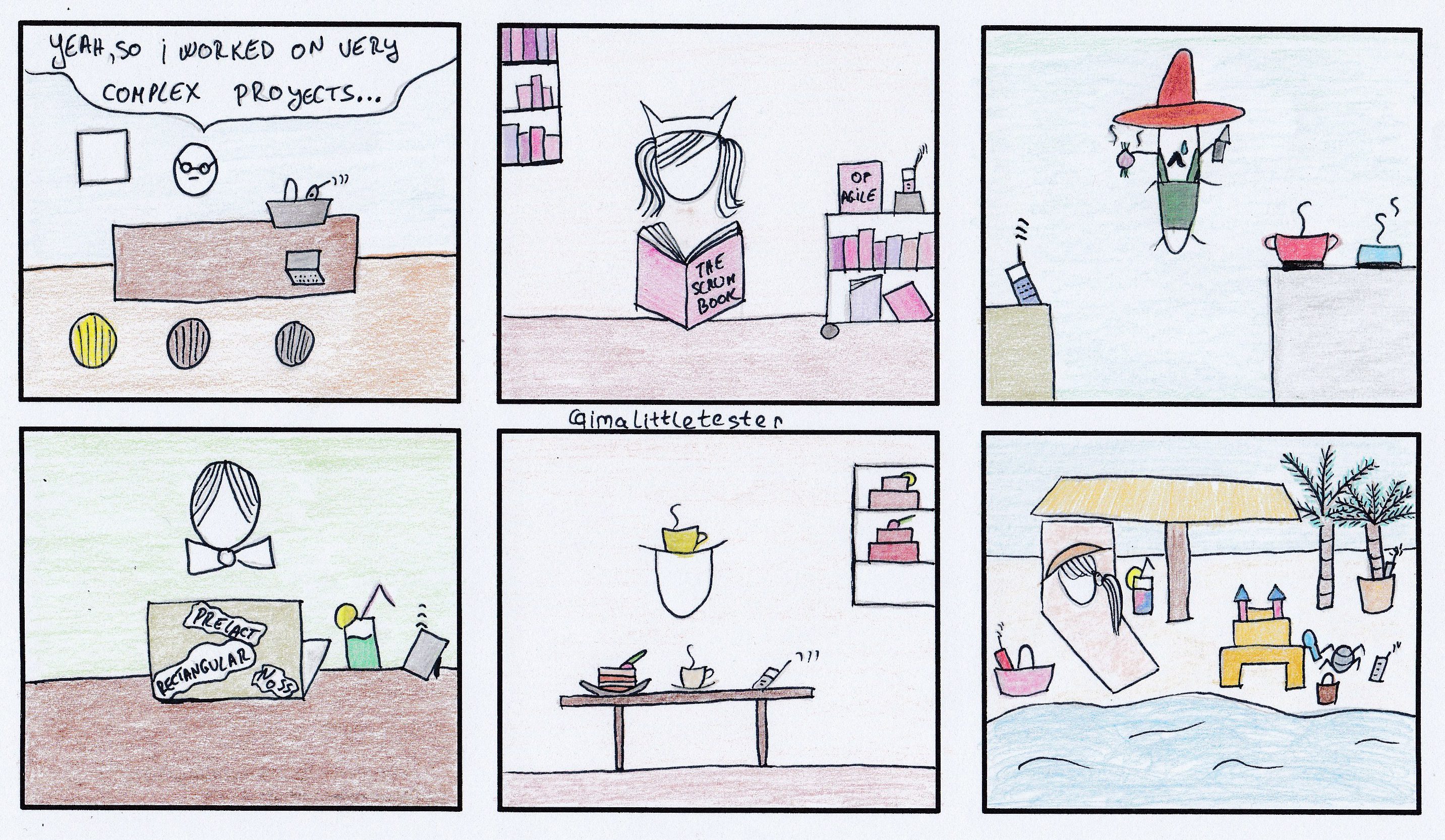 These are the made up stories of a team working in an Agile environment. Their daily struggles and successes are presented in a comic/parody/satirical way. Click on the image to see it in full size.