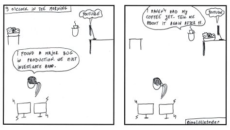 These are the made up stories of a team working in an Agile environment. Their daily struggles and successes are presented in a comic/parody/satirical way. Click on the image to see it in full size.