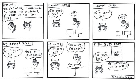 These are the made up stories of a team working in an Agile environment. Their daily struggles and successes are presented in a comic/parody/satirical way. Click on the image to see it in full size.