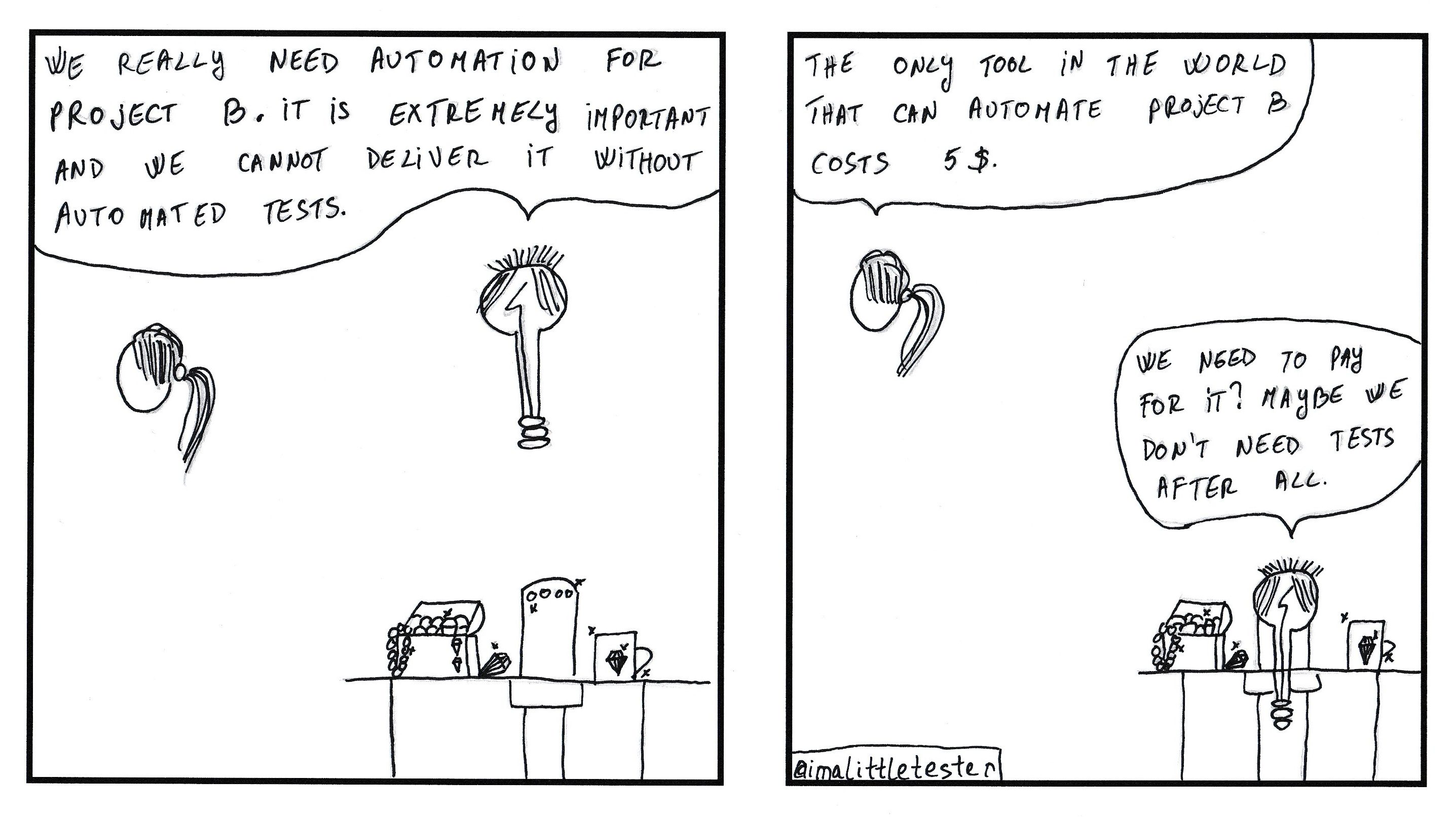 These are the made up stories of a team working in an Agile environment. Their daily struggles and successes are presented in a comic/parody/satirical way. Click on the image to see it in full size.