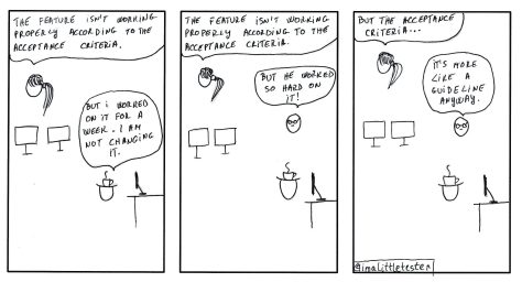 These are the made up stories of a team working in an Agile environment. Their daily struggles and successes are presented in a comic/parody/satirical way. Click on the image to see it in full size.
