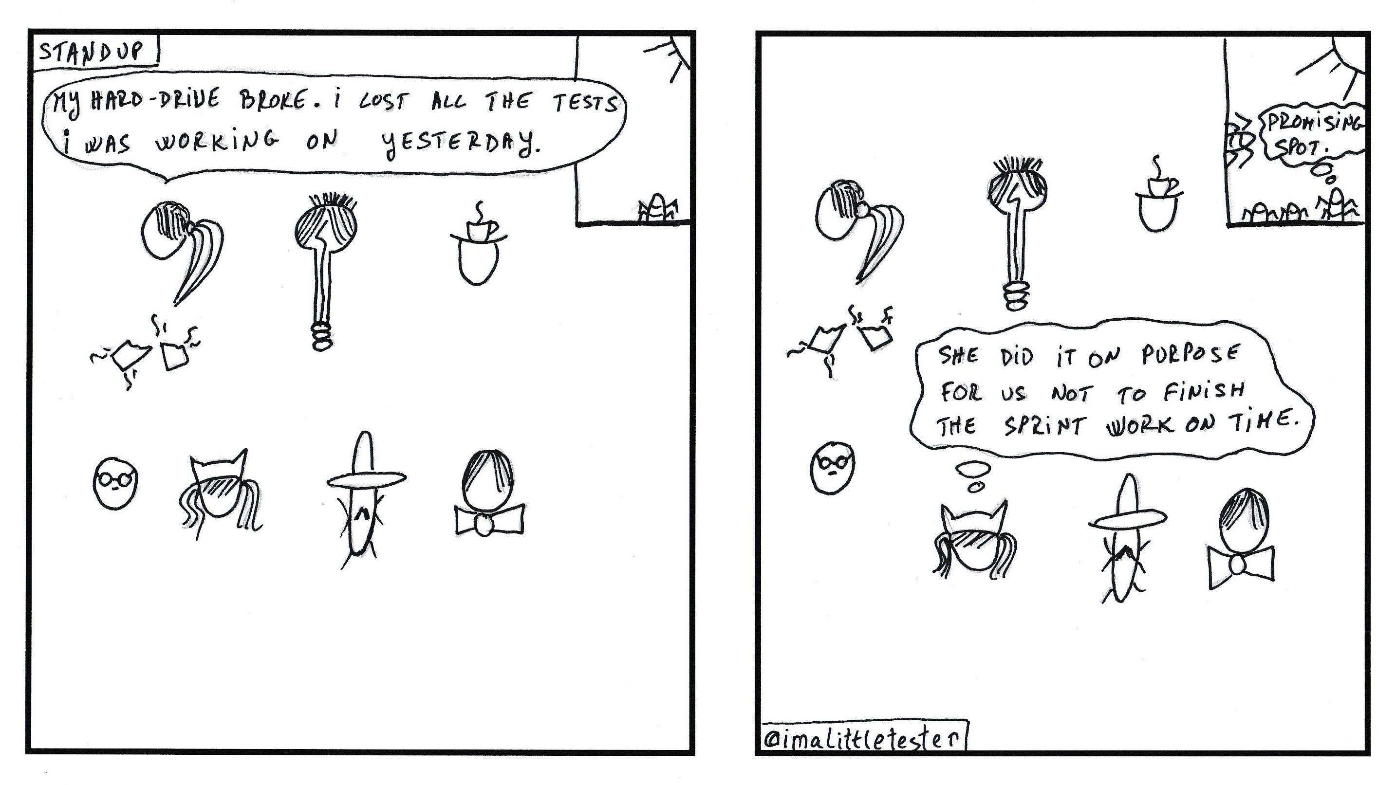 These are the made up stories of a team working in an Agile environment. Their daily struggles and successes are presented in a comic/parody/satirical way. Click on the image to see it in full size.