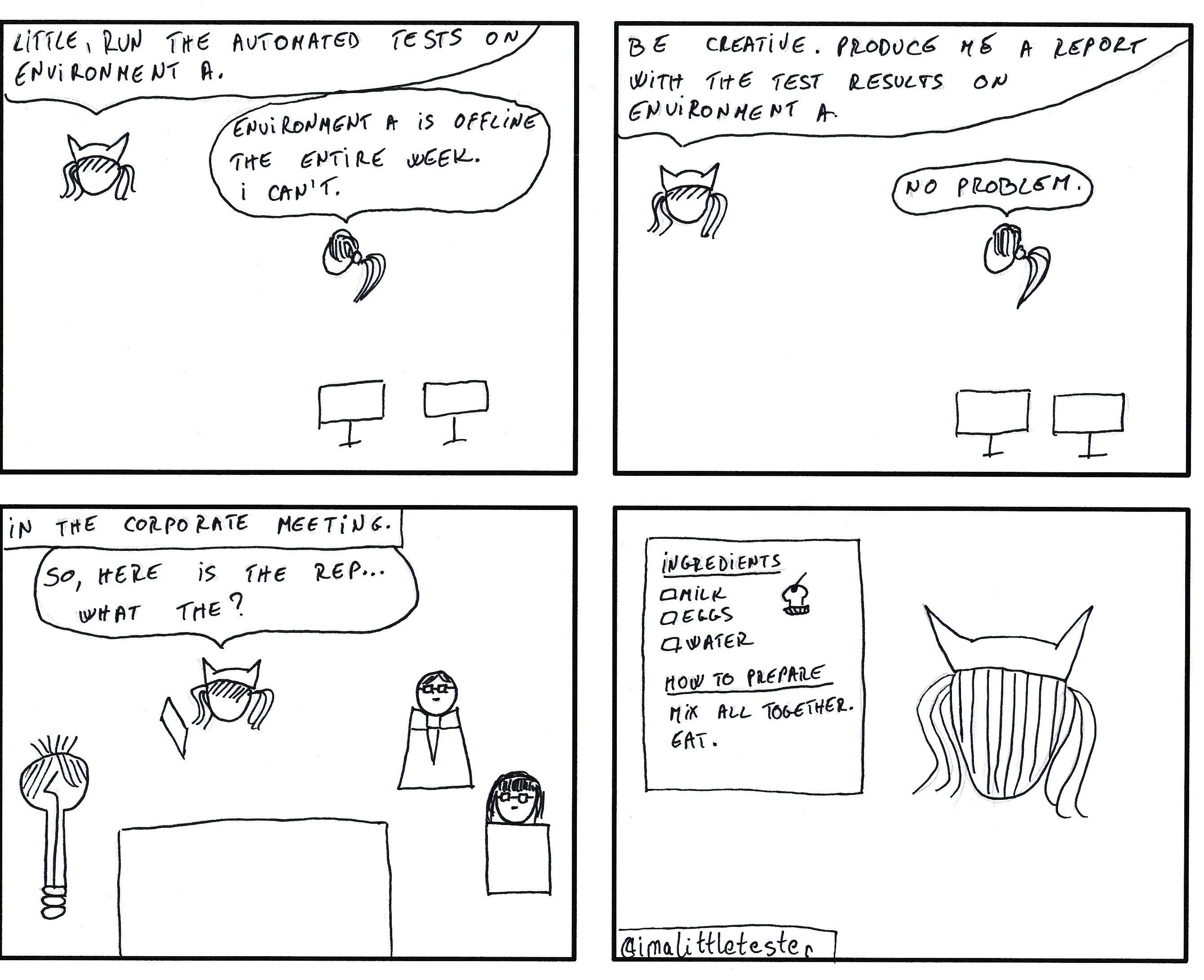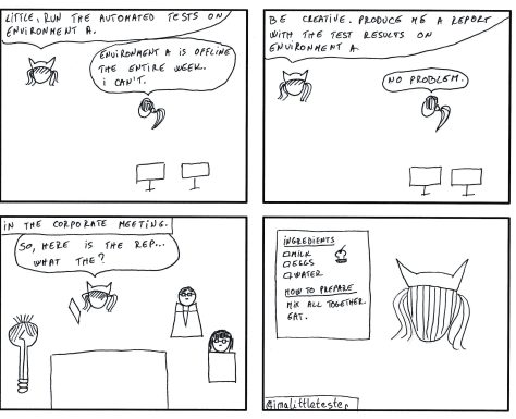 These are the made up stories of a team working in an Agile environment. Their daily struggles and successes are presented in a comic/parody/satirical way. Click on the image to see it in full size.