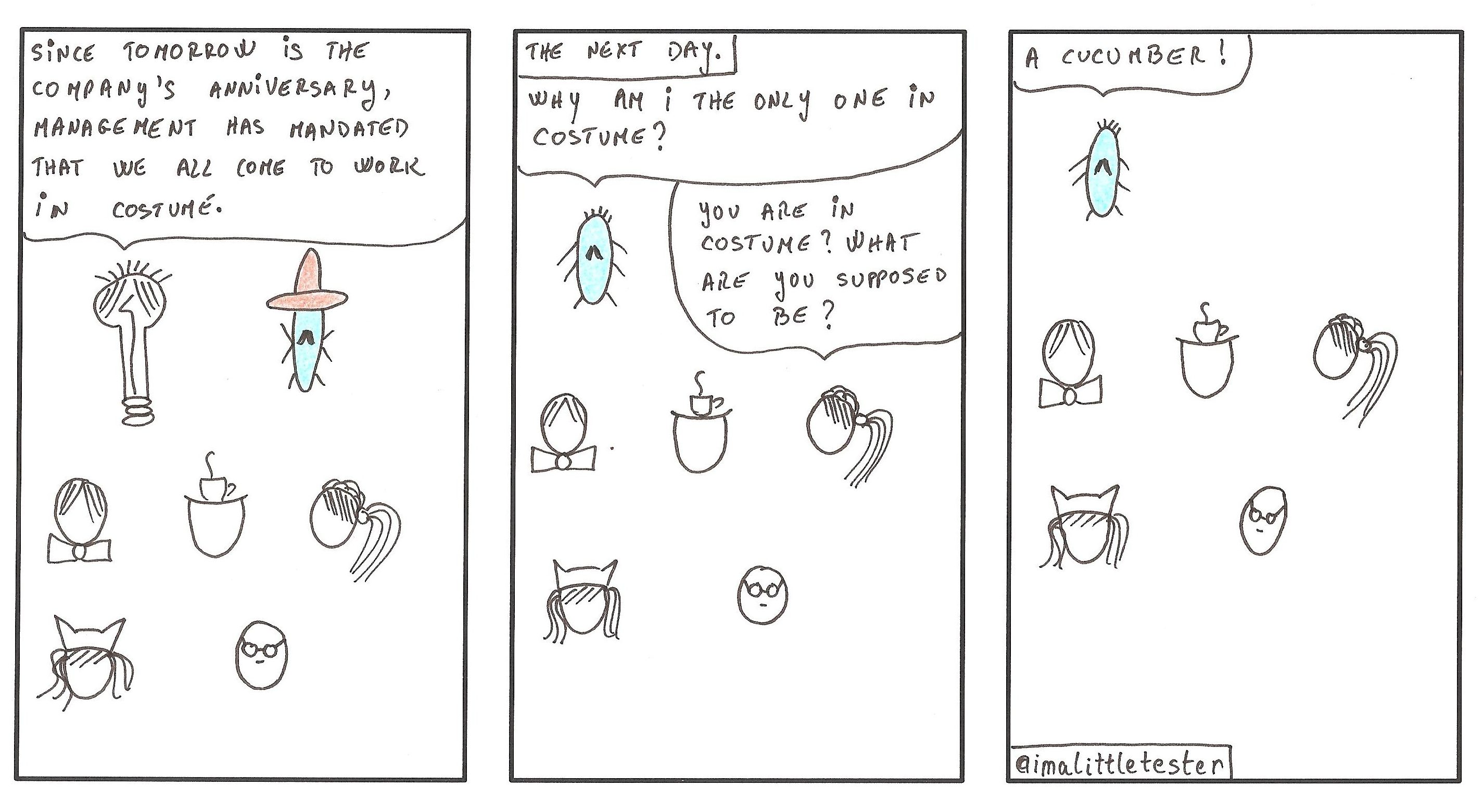 These are the made up stories of a team working in an Agile environment. Their daily struggles and successes are presented in a comic/parody/satirical way. Click on the image to see it in full size.