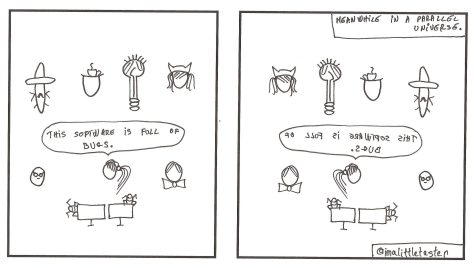 These are the made up stories of a team working in an Agile environment. Their daily struggles and successes are presented in a comic/parody/satirical way. Click on the image to see it in full size.