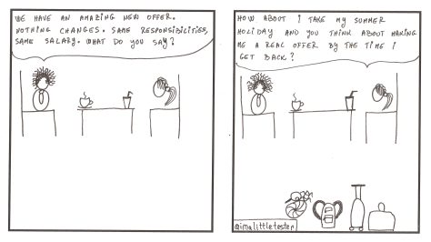 These are the made up stories of a team working in an Agile environment. Their daily struggles and successes are presented in a comic/parody/satirical way. Click on the image to see it in full size.
