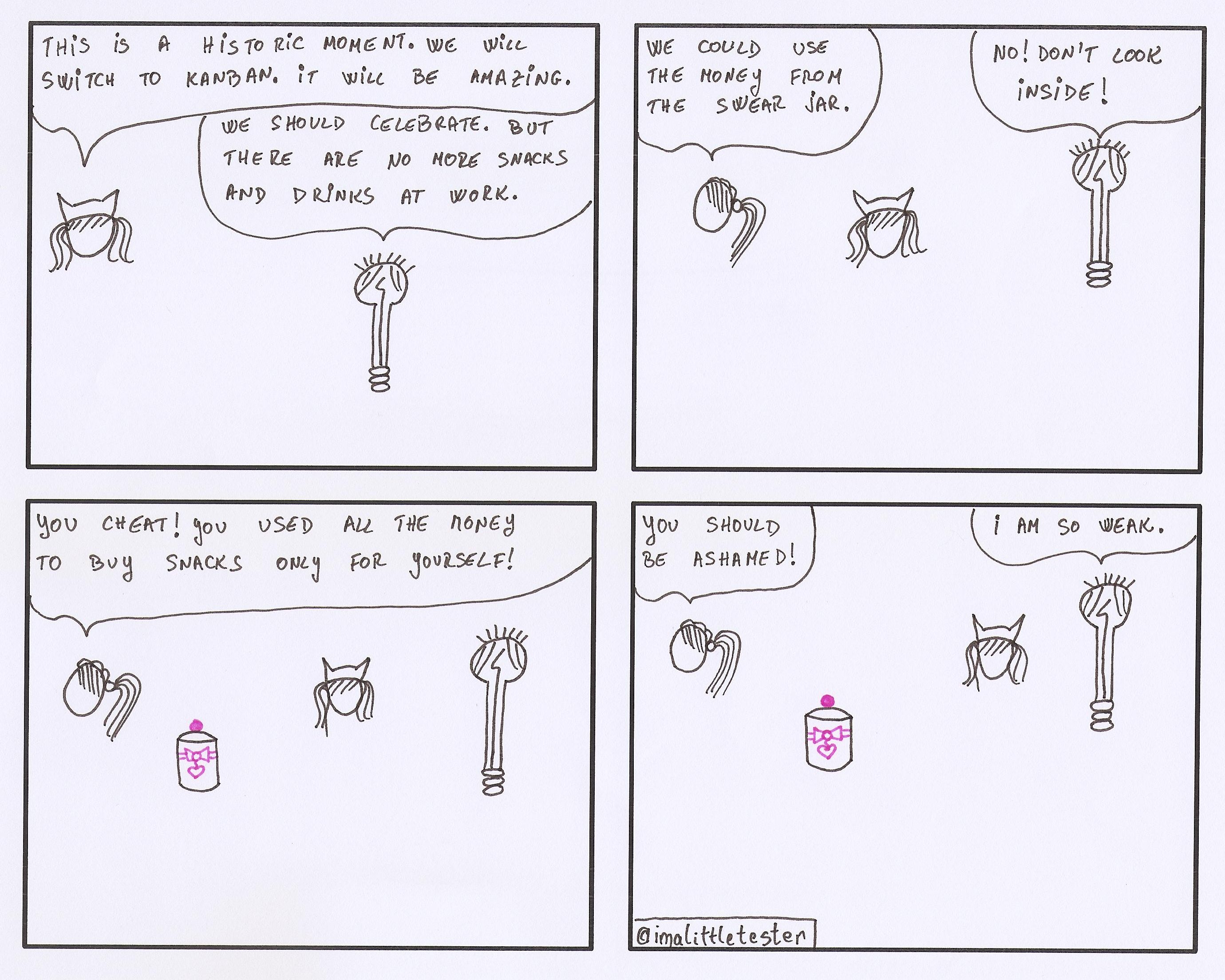 These are the made up stories of a team working in an Agile environment. Their daily struggles and successes are presented in a comic/parody/satirical way. Click on the image to see it in full size.