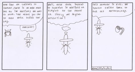 These are the made up stories of a team working in an Agile environment. Their daily struggles and successes are presented in a comic/parody/satirical way. Click on the image to see it in full size.