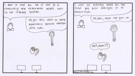 These are the made up stories of a team working in an Agile environment. Their daily struggles and successes are presented in a comic/parody/satirical way. Click on the image to see it in full size.